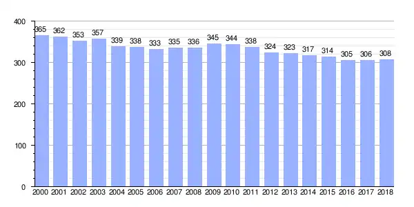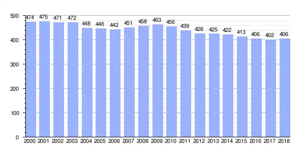 | Gráfica de evolución demográfica de Lañas (parroquia) entre 2000 y 2018 |