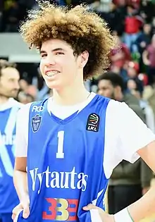 El 11 de diciembre de 2017, Ball ficha con Prienai de la Lithuanian Basketball League (LKL) y Baltic Basketball League (BBL), junto con su hermano LiAngelo.[65] Aunque ellos tenían la opción de abandonar el club después de un mes, ellos permanecieron allí durante el resto de la temporada.[66] Ball reportedly became the youngest American to ever sign a professional basketball contract.[67] The brothers' move to Lithuania was heavily reported by American sports media.[68][69] El 9 de enero de 2018, Ball hizo su debut con el Prienai en la Big Baller Brand Challenge Games, una serie de partidos de exhibición creados para presentar a los hermanos Ball, registrando 10 puntos y 9 asistencias en una victoria 90-80 sobre Žalgiris-2 Kaunas.[70] Cuatro días después, jugó su primer partido en la LKL contra Lietkabelis Panevėžys.[71] Ball Marcó sus primeros puntos a nivel profesional el 21 de enero, cuando marcó 13 puntos en una derrota 116-93 frente a Pieno žvaigždės Pasvalys.[72][73] El 4 de febrero, consiguió una marca personal al marcar 19 puntos, con 4 triples y 6 asistencias, en una derrota frente Žalgiris Kaunas.[74] En una derrota el 26 de febrero contra Wilki Morskie Szczecin en el Big Baller Brand International Tournament, una competición amistosa, Ball sufrió una lesión en la pierna que lo dejó sin jugar durante un mes.[75][76] El 25 de abril dejó Prienai con su familia, mientras su padre mostraba resentimiento hacia el entrenador en jefe del equipo Virginijus Šeškus.[77][78] Ball terminó la LKL temporada promediando 6.5 puntos y 2.4 asistencias, con un 26.8 por ciento en tiros de campo, en 12.8 minutos por partidos.[79]