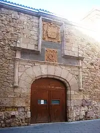 ![]() Fachada oeste de la antigua Alhóndiga del Pan, con el escudo de los Reyes Católicos. | ||
