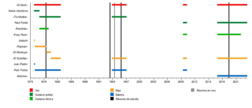 Juan «Raf» Pulido Modesto Agriarte («Tío Modes» o "El Metralleta») Emilio Hita («Rockhita») Salvador Solano («Rayban» o «El Llobregat») Feliciano Montoya («El Montoya») «Fosy Rock» Alberto Chazarra Joaquín «Bubi» Tony López Jaume Planas Pedro («Peret» o «Peter») Planas Carlos Motos («Cordiola») «Madera Bill» Javier Otopac Raúl «El Loli» Juan Pastor Juano Montero «Betty Love» | ||
