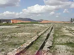 Entre los restos exhumados destaca sobremanera el suelo de una de las viviendas, en la cual se ha encontrado una inscripción ibérica sobre un mosaico romano realizado con teselas blancas de caliza, con dimensiones en torno a un centímetro de lado. Presenta en su composición tres capas; primero se observa una preparación del lecho donde se va a construir el pavimento mediante la extensión de una capa de tierra arcillosa, sobre la que se colocó un lecho de cantos rodados aglutinados por medio de un mortero de cal. La capa superior está formada por pequeños cantos de caliza y fragmentos de cerámica de tipo ibérico, sobre la que se incrustaron las teselas que forman el esquema decorativo.