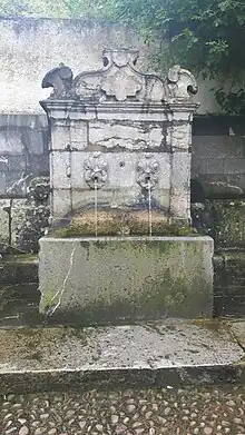 Se trata de una fuente de reducidas dimensiones, que consta de una pileta adosada a una fachada en la que se ubican dos caños incrustados en sendas máscaras o rostros antropomorfos. Por encima de los caños, un entablamento clásico con su correspondiente cornisa proporciona a la fuente un aspecto monumental. El conjunto se ve coronado por un frontón mixtilíneo, que hace de marco a su vez a una pequeña lápida dedicatoria. Unas volutas o motivos vegetales sirven de ornamento a los extremos de dicho frontón. Todo el conjunto se ve flanqueado por una suerte de bancos o canapés muy al gusto clasicista de la época.