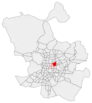 ![]() Guindalera (rojo) en el distrito de Salamanca (rosa) y en el término municipal de Madrid (gris) | |||||||||