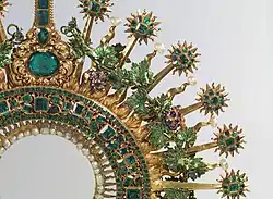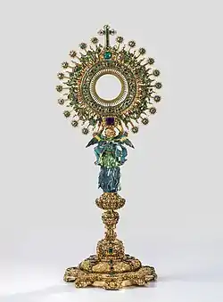 El disco principal es de forma circular con rayos ondulantes que simbolizan al sol. Del centro hacia afuera, perlas barrocas (perlas que no son esféricas) rodean el espacio reservado para la hostia, que a su vez rodean las ondas de oro y cuatro capas de piedras preciosas, principalmente esmeraldas. Una gruesa guirnalda de hojas de vid esmaltadas en verde con uvas de amatista adorna otros 20 rayos ondulantes, cada uno coronado por una perla. Intercalando estos, 22 rayos de sol principales que terminan en discos solares radiantes en oro y esmeraldas.[3] Todo este esquema circular se encuentra coronado por una cruz de esmeralda; y debajo de él, una figura de ángel similar a Atlas envuelto en una túnica con esmaltes azules y verdes. El ángel lleva cáligas (un tipo de calzado romano) y sobre su cabeza lleva un único zafiro amarillo, mientras que del lado opuesto hay una amatista cuadrada de alta calidad.[3]