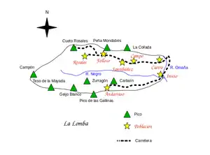 La Lomba limita al norte y al este con el valle del Omaña, al sur con el de Valdesamario y al oeste con el Valle Gordo. Es una meseta rodeada de montes y tesos poco escarpados, el más alto de los cuales es el Campón al suroeste (1638 m). También destacan el Cueto de Rosales (1557 m) al norte, y Teso de la Mayada (1598 m), Pico de las Gallinas (1489 m) y el Carbaín (1470 m) en la Sierra de la Salsa, al sur.[2] La altitud media decrece de oeste a este. El río Negro fluye por el centro del valle hasta desembocar en el Omaña en el término de Inicio. Las poblaciones en el interior de la Lomba están situadas en la margen norte del río Negro, con orientación al sur. Este es el caso de Rosales, Folloso, Santibáñez, Campo y Castro. La excepción es Andarraso, ubicado en la ladera sur del Carbaín.[3]