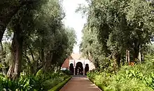 Compuestos por olivos, palmeras, rosales, jacarandas, naranjos, pinos de Alepo, buganvillas, adelfas y una avenida con ochenta cactus, los jardines ocupan una superficie de ocho hectáreas[9] en el seno de un dominio de quince hectáreas en total,[5] y son conservados por setenta jardineros. Desde los jardines puede verse el minarete de la Mezquita Kutubía, al igual que las cimas nevadas de la cordillera del Atlas.