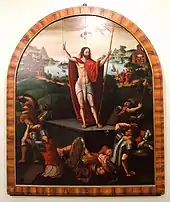Está realizada en óleo sobre tabla y representa el episodio evangélico de la Resurrección de Jesús, en la que aparece portando en la mano izquierda una cruz. Destaca la composición por su calidez y luminosidad, así como por su detallismo y minuciosidad.[2]