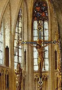 De forma inusual para una catedral gótica del siglo XIII, la mayoría de las ventanas tienen cristales sin colores.[15] John L. Ward observó que la única ventana que mostraba al completo la parte superior era aquella que estaba detrás del crucifijo suspendido. Esa ventana, de frente al espectador, contiene intrincados dibujos de flores rojas y azules. Por efecto visual las flores ofrecen la ilusión de situarse encima de la misma cruz, de igual modo que si emanaran de ella.[30] Ward ve en este hecho una referencia subliminal a la iconografía y mitología del árbol de la vida en el libro del Génesis. El autor reconoce sin embargo la sutileza de esta ilusión, y el hecho de que ninguna de las dos copias conocidas de la obra (cercanas en fecha) incluye este motivo. La idea de flores brotando de la cruz podría estar tomada de la Crucifixión de Masaccio de 1426. Ward concluye que van Eyck llevó la idea más lejos al mostrar las flores surgiendo de otra fuente, y que el artista buscó pintar el momento en el que el árbol de la vida y la cruz cobran vida mientras el espectador observa.[30]