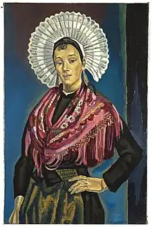 Esta obra es posterior a la etapa cubista de Blanchard, que finalizó en 1918.[1] En esta nueva etapa, Blanchar prefería representar de modo casi monumental el motivo femenino, lo que se refleja en esta obra, ya que la figura ocupa casi toda la altura del lienzo.[1] La culminación de la figura con el soleil, una cofia de encaje blanco almidonado y encañonado, enaltece a la mujer resaltando su protagonismo.[1]