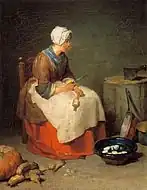 - Esta obra contiene una traducción derivada de «The Laundress (Greuze)» de Wikipedia en inglés, concretamente de esta versión, publicada por sus editores bajo la Licencia de documentación libre de GNU y la Licencia Creative Commons Atribución-CompartirIgual 4.0 Internacional.
