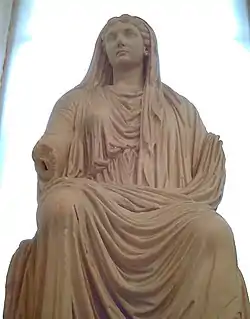 En la Antigua Roma, todas las mujeres que nacían libres eran ciudadanas (cives),[lower-alpha 1] pero no podían votar ni ocupar cargos públicos.[3] Debido a este limitado papel público de la mujer en la Antigua Roma, los historiadores romanos mencionan con menos frecuencia a las mujeres que a los hombres. Sin embargo, mientras que las mujeres romanas en general no tenían ningún poder político directo, las de familias ricas y destacadas podían ejercer (y de hecho ejercían) gran influencia a través del entorno privado.[4] Entre las mujeres excepcionales que han dejado una marca indeleble en la historia están las semilegendarias Lucrecia y Claudia Quinta, cuyas historias tienen un matiz mítico; las decididas mujeres republicanas como Cornelia, madre de los Gracos, y Fulvia, que comandó un ejército y acuñó monedas con su imagen; las mujeres de la dinastía Julio-Claudia como Livia Drusila, la más prominente, que contribuyó a la formación de las costumbres imperiales; y la emperatriz Helena, una fuerza motriz en la propagación del cristianismo.[lower-alpha 2]