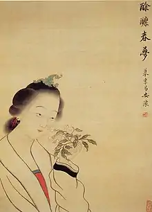 Aunque la dinastía Qing intentó acabar con esta práctica (las mujeres manchúes tenían prohibido vendarse los pies), no fue posible lograrlo entre los chinos Han.[116] Como en periodos anteriores, se esperaba que las mujeres acataran las Tres Obediencias y obedecieran a sus padres en la infancia, a sus maridos cuando se casaban y a sus hijos cuando enviudaban. Los nombres de pila de las mujeres generalmente se desconocen; se las llamaba "la esposa de [X]" o "la madre de [X]".[117] Los logros de una mujer a lo largo de su vida estaban estrechamente relacionados con su capacidad para tener hijos; aquellas que no podían ser despreciadas por sus maridos, familia política y vecinos. Si una mujer no daba a luz en el transcurso de unos años, el marido solía tomar una concubina.[118] Las cartas escritas en escritura de mujeres entre hermanas de sangre muestran que muchas mujeres se sentían abandonadas al enviudar, por lo que casarse de nuevo era una opción atractiva, sobre todo si no tenían hijos o padres (afines o natales) de los que depender dentro de la sociedad patriarcal.[119]