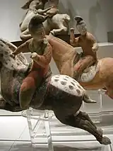 Algunas de las ocupaciones a las que se dedicaban las mujeres eran el comercio (venta de alimentos),[74] tejer, criar gusanos de seda,[75] cantar, bailar,[76] hacer acrobacias,[77] espectáculos callejeros,[78] contar cuentos[79] y ser secretarias de funcionarios.[80] El ingreso en una institución religiosa también era una opción profesional para muchas mujeres. A principios del siglo VIII, en Chang'an, existían 27 conventos budistas y 6 templos taoístas con sacerdotisas.[81] Las monjas participaban en procesiones religiosas, como la llegada de una reliquia budista a Chang'an, cuando monjas y monjes caminaron detrás del vehículo que transportaba el hueso del dedo de Buda.[82]