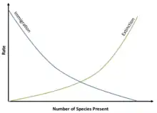 La Teoría de Biogeografía Insular tiene sus raíces en el trabajo de Wilson con las hormigas de Melanesia. MacArthur sintetizó las ideas de Wilson acerca de la competencia, colonización y equilibrio en una representación gráfica sencilla de curvas de inmigración y extinción, de la cual puede determinarse el número de especies en equilibrio en una isla.[3] Las ideas de MacArthur y Wilson fueron primero presentados en un artículo publicado en 1963, y fueron más desarrolladas en un libro.[4][3]