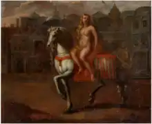 La composición del cuadro, bastante sencilla en apariencia, representa a la joven mujer sobre un majestuoso caballo blanco. Teniendo en cuenta que no hay referencias directas en las fuentes acerca del color del equino, se puede deducir que este, lejos de ser un elemento aleatorio, hace referencia directa a la castidad, la pureza y la virtud de la joven que lo cabalga. En lo referente a la disposición del retrato ecuestre, se podría citar la influencia de las anteriores obras que reflejaban la historia, tanto pictóricas o escultóricas, o incluso el cuadro “Retrato de un caballo blanco” de Gericault.[3]