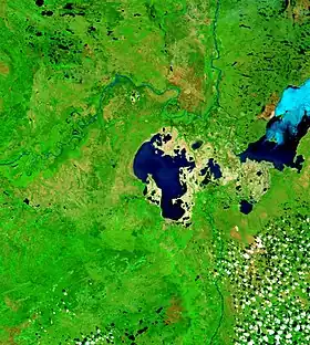 ![]() Delta Peace-Athabasca, con el lago Claire, al oeste del extremo del lago Athabasca y bocas del río de la Paz (al norte) y río Athabasca (sur) | ||