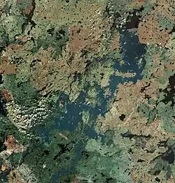 El lago se encuentra en una región de bosque boreal compuesta principalmente de pino de Banks, abeto y alerce oriental.[7]