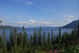 ![]() El lago visto desde la ribera noroeste, con la isla de Gudfjelløya a la derecha. | ||