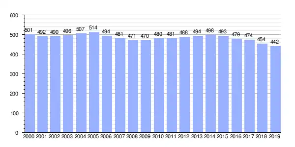 | Gráfica de evolución demográfica de Lamas entre 2000 y 2019 |