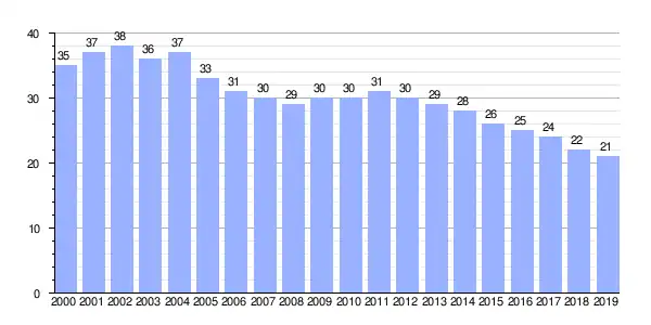| Gráfica de evolución demográfica de Lamas (aldea) entre 2000 y 2019 |