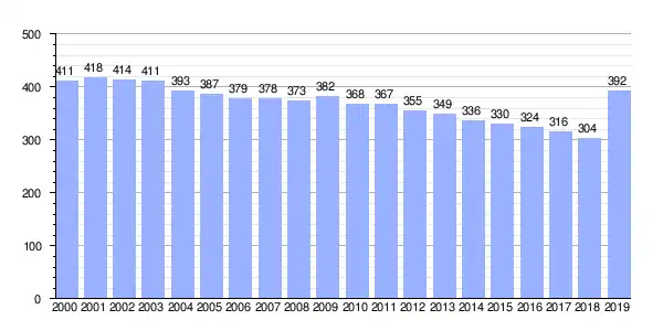 | Gráfica de evolución demográfica de Lamas (parroquia) entre 2000 y 2019 |