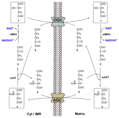 Interviene ahora el segundo transportador antipuerto; es el transportador de glutamato-aspartato, que importa glutamato del citosol y lo lleva a la matriz mitocondrial y exporta aspartato de la matriz y lo lleva al citosol. Una vez en el citosol, el aspartato se convierte en oxaloacetato en una reacción catalizada por la aspartato aminotransferasa citosólica.[3]