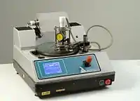 La segunda imagen muestra una máquina de lapear comercial con un plato de lapear relativamente pequeño, ya que máquinas con platos de hasta 3 metros de diámetro son habituales. La pieza se colocaría sobre el plato, dentro de los anillos, y se colocaría un peso encima para que ejerza una presión de entre 0,2 y 0,3 MPa.[3] Al funcionar, los anillos mantendrían la pieza sujeta mientras la placa inferior gira.