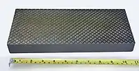 Cuando el lapeado se realiza manualmente se emplea una placa plana estriada[2] como la de la primera imagen. Por ejemplo, se podría extender polvo de esmeril sobre la superficie de la placa, que después se frotaría contra la pieza a lapear con un movimiento irregular, rotatorio, quizás en forma de ocho para que el desgaste sea uniforme.