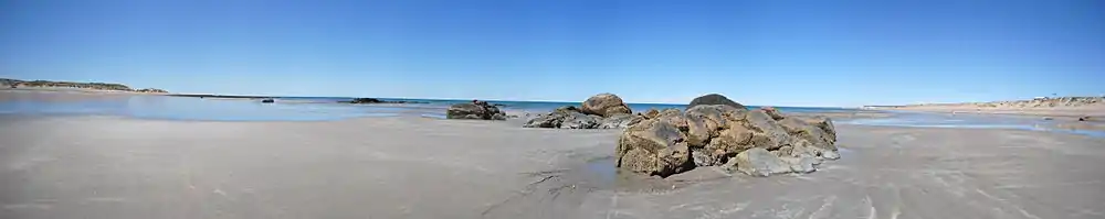 La playa es llamada la «Playa de la Patagonia»,[11] su zona de influencia y servicios se extiende a lo largo de unos 3 km y un ancho máximo de 1 km durante la bajamar, con una suave pendiente inferior al 1%, oscilando las mareas entre los 8 y 10 metros respecto a la profundidad de las aguas.[3]