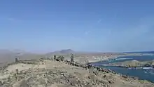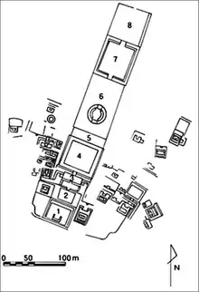 El complejo arqueológico presenta áreas donde se realizaron funciones diferenciadas. En primer lugar, contamos con el edificio monumental erigido sobre una ladera rocosa colindante con el mar y definida por una serie de plataformas rectangulares que definen a la estructura como una pirámide trunca, resaltando la presencia de una gran plaza oval hundida. Junto con los demás edificios comparten elementos arquitectónicos como escalinatas, recintos en forma de U, áreas de circulación y demás habitaciones que completan la arquitectura monumental.