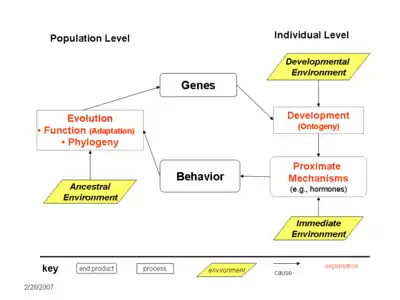 La evolución, que está determinada tanto por la función como por la filogenia, da como resultado los genes de una población. Los genes de un individuo interactúan con su entorno de desarrollo, dando como resultado mecanismos como el sistema nervioso. Un mecanismo (que también es un producto final por derecho propio) interactúa con el entorno inmediato del individuo, lo que da como resultado su comportamiento.