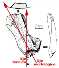 Ejemplo de los ejes técnico y morfológico en una lasca prehistórica desviada