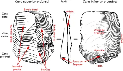 • El talón, que normalmente se representa en la parte baja del dibujo,[6] es el trozo de núcleo que entró en contacto con el percutor, desprendiéndose junto con la lasca.[7] El talón, entre otras cosas, aporta información sobre si hubo o no preparación previa de la zona del núcleo que iba a recibir el impacto. Por eso, se distinguen diferentes tipos:
