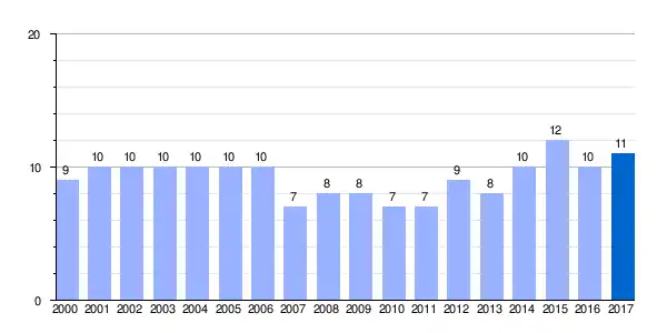 | Gráfica de evolución demográfica de Lasierra[5] entre 2000 y 2017 |