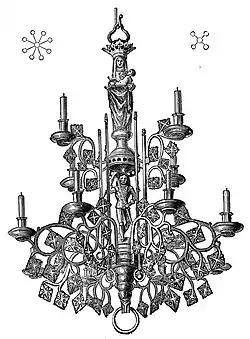 La obra más antigua en latón del distrito de Mosa es la fuente en la iglesia de San Bartolomé en Lieja, una maravillosa vasija apoyada en bueyes, el exterior del cuenco hecho en alto relieve con grupos de figuras participando de ceremonias bautismales; fue realizada entre 1113 y 1118 por Renier de Huy, el fabricante de un hermoso incensario en el museo de Lille. A partir de entonces se realizaron una serie de magníficas obras para iglesias y catedrales en forma de fuentes, atriles, candelabros pascuales y de altar, tabernáculos; las fuentes de contorno simple tienen cubiertas ricas frecuentemente adornadas con temas de figuras; los atriles generalmente están coronados por un águila de forma convencional, pero a veces por un pelícano; un grifo corona el atril de Andenne. Las gradas que sostienen estas aves son a veces de rica tracería gótica, con figuras y restos sobre leones; las formas posteriores muestran un eje de forma cilíndrica, con molduras a intervalos, que se extiende a una base ancha. Varias de estas obras se encuentran en Alemania en el distrito de Colonia, que puede sean de fabricación local; algunas permanecen en las iglesias de Venecia. Existen varias obras en iglesias inglesas, como en Norwich, St Albans, Croydon y otros lugares. En su mayor parte, siguen el mismo modelo, y probablemente fueron importados de Bélgica; existen candelabros de bronce en la Iglesia del Templo, Bristol, en el Monte de San Miguel, Cornualles, y en el Norte de Gales. Los atriles deben haber establecido la moda en Inglaterra para este tipo de objeto; durante varios siglos se los encuentran, como en la Capilla de San Jorge, el Castillo de Windsor, la Capilla del King's College, Cambridge, la Catedral de San Pablo y algunas iglesias de Londres. En la región de Colonia se produjo mucho trabajo de bronce y todavía permanece en las iglesias; se destaca el hermoso trascoro de la Catedral de Xanten, el trabajo, se dice, de un artesano de Maastricht, Países Bajos, a principios del siglo XVI. Un ejemplo moderno es el trascoro de Hereford en la catedral de Hereford, hecha por George Gilbert Scott en 1862 en una variedad de metales donde domina el bronce.