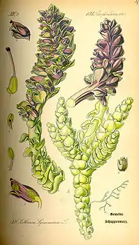 La planta, geófita, de hojas muy pequeñas, de ramas blancuzcas, se coloca en torno al tronco del árbol o arbusto parasitado desarrollando un rizoma escamado con haustorios (raíz haustorial)