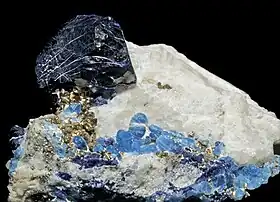 La lazulita es un mineral del grupo de los fosfatos. Es un hidroxi-fosfato de aluminio, hierro y magnesio. Sus cristales son de color azul intenso, característica por la que se le puso nombre, el cual deriva de la palabra árabe lazurd que significa "cielo"[1] y del griego litos, piedra. Sinónimos poco usados de este mineral son: berkeyita, gersbyita, mollita, tetragophosphita y voraulita.