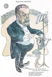 ![]() Caricatura de León Ribeiro creada por Orestes Acquarone en 1912 para su revista La Semana. | ||