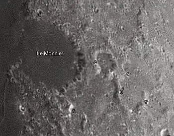 Por convención estos elementos son identificados en los mapas lunares poniendo la letra en el lado del punto medio del cráter que está más cercano a Le Monnier.