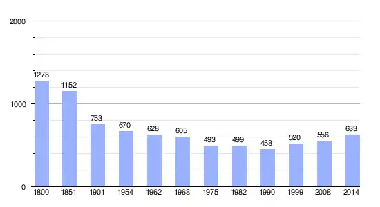 Los datos demográficos contemplados en este gráfico de la comuna de Le Vrétot[4] se han cogido de 1800 a 1999 de la página francesa EHESS/Cassini, y los demás datos de la página del INSEE.[5]