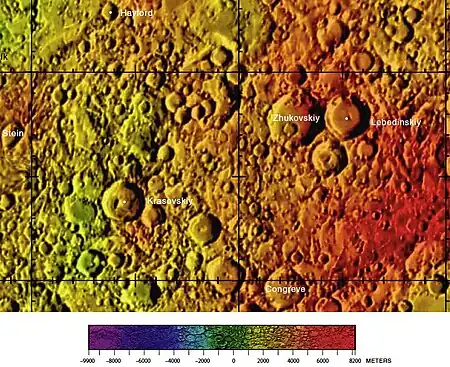 Lebedinskiy se encuentra al suroeste de la Cuenca Dirichlet-Jackson.