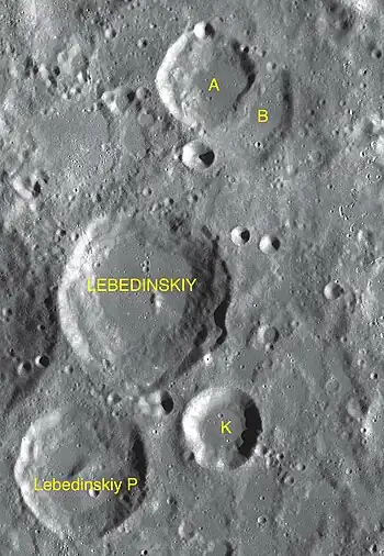 Por convención estos elementos son identificados en los mapas lunares poniendo la letra en el lado del punto medio del cráter que está más cerca de Lebedinskiy.