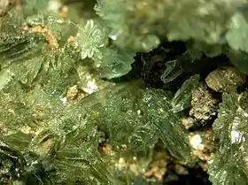 Aunque es más común que aparezca rellenando completamente vetas, en forma de cristales fibrosos transversales a la veta.