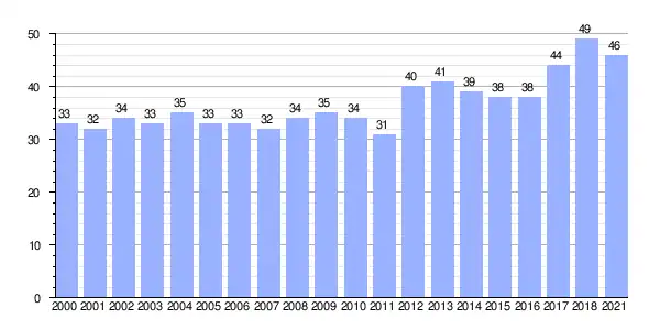 | Gráfica de evolución demográfica de As Leiras entre 2000 y 2021 |