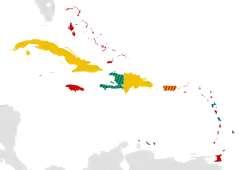 - Español: idioma oficial de Cuba, la República Dominicana y Puerto Rico (cooficial);[4] además de las regiones insulares y costeras de las Islas de la Bahía (Honduras), las Islas del Maíz (Nicaragua), Isla Cozumel, Isla Mujeres (México), Nueva Esparta (Venezuela) las Dependencias federales de Venezuela, el archipiélago de San Andrés, Providencia y Santa Catalina (Colombia) y el archipiélago de Bocas del Toro (Panamá).[5]
