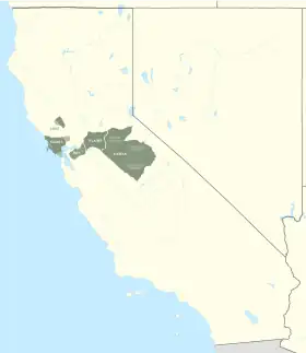 ![]() Mapa de California mostrando la distribución de las lenguas miwok.