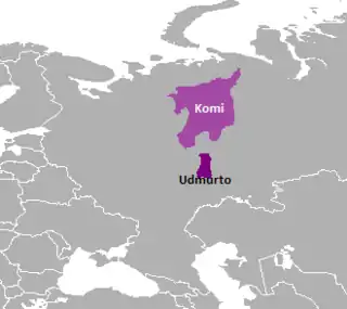 El udumurto presenta una alternancia similar para un número de grupos de la forma consonante sonora+/m/, mientras que en komi-ziriano aparecen grupos de la forma consonante sonora+/j/.[5]
