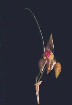 Es una orquídea de pequeño tamaño, con hábitos de epífita con un tallo erecto a ascendente, de color rojo envuelto por 2 a más vainas fundibuliformes, con margen ciliolado y llevando una sola hoja, apical, erecta, de color verde oscuro a rubio, carnosa, glabra, algo undulada, elíptica a oblanceolada, obtusa a subaguda, tridentada apicalmente, disminuyendo por debajo en la base cortamente peciolada. Florece desde finales del invierno hasta la primavera en 1 a 2 inflorescencias, a menudo más cortas que la hoja, con 3-8 flores con brácteas florales ovadas-cuculadas, glabras agudas que son más largas que el ovario.[1] Se encuentra en México (Guerrero, Oaxaca) y en Costa Rica, Guatemala y Panamá, a elevaciones de 1100 a 1900 metros.