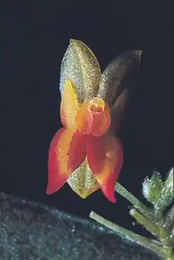- Esta obra contiene una traducción derivada de «Lepanthes scopula» de Wikipedia en inglés, publicada por sus editores bajo la Licencia de documentación libre de GNU y la Licencia Creative Commons Atribución-CompartirIgual 4.0 Internacional.