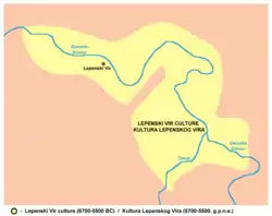 Lepenski Vir es un asentamiento de la prehistoria europea localizado en Serbia que data de más de 8000 años y que desarrolló un sistema económico y sociocultural elaborado.[1] Se encuentra cerca al río Danubio, concretamente, a su paso en el desfiladero de las Puertas de Hierro.[2] Las principales excavaciones fueron realizadas entre 1965 y 1971 por Dragoslav Srejović, de la Universidad de Belgrado.[2] Se han encontrado herramientas hechas en piedra y en hueso, así como hogares y numerosos objetos religiosos entre los que se encuentran esculturas únicas hechas en piedra.